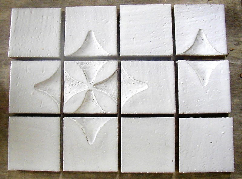 12月のトピックスは、‘特注100mm角ハンドメイドレリーフタイル‘です。製法は、湿式ハンドメイド製法です。土練器から帯状に圧縮成形された生地を、ピアノ線で焼成寸法100mm角になるように概ねカット成型・部分的に生地に彫刻加工して乾燥後、白のドロ釉で施釉・焼成して制作致しました。手作り特有の温かみとざっくりした質感が独特の空間を演出致します。また、焼成時に釉薬が流れて釉薬だまりができやすい軟解釉やブライト釉を使い濃淡のある焼き物の質感を強調する仕上げも楽しん頂けると思います。